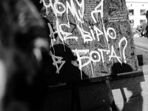 Ми використовуємо великий стенд із написом "Чому я не вірю в Бога?".